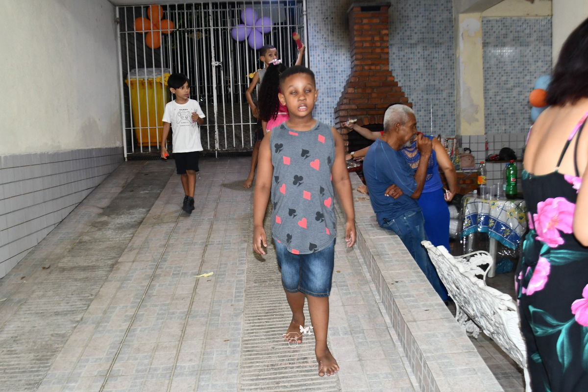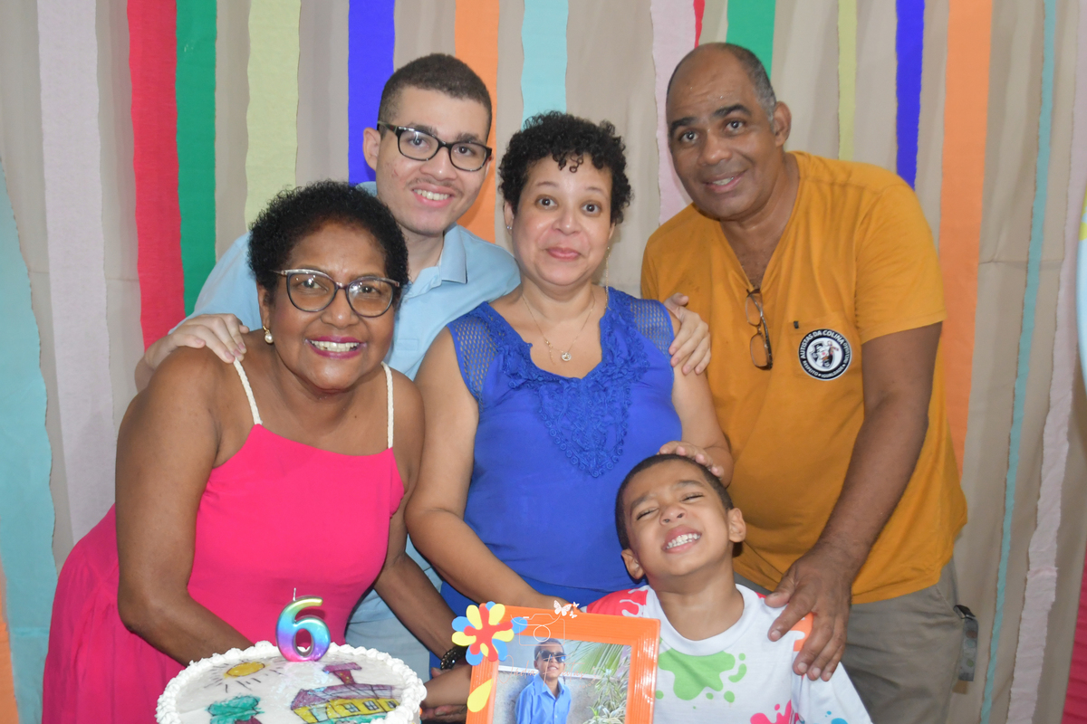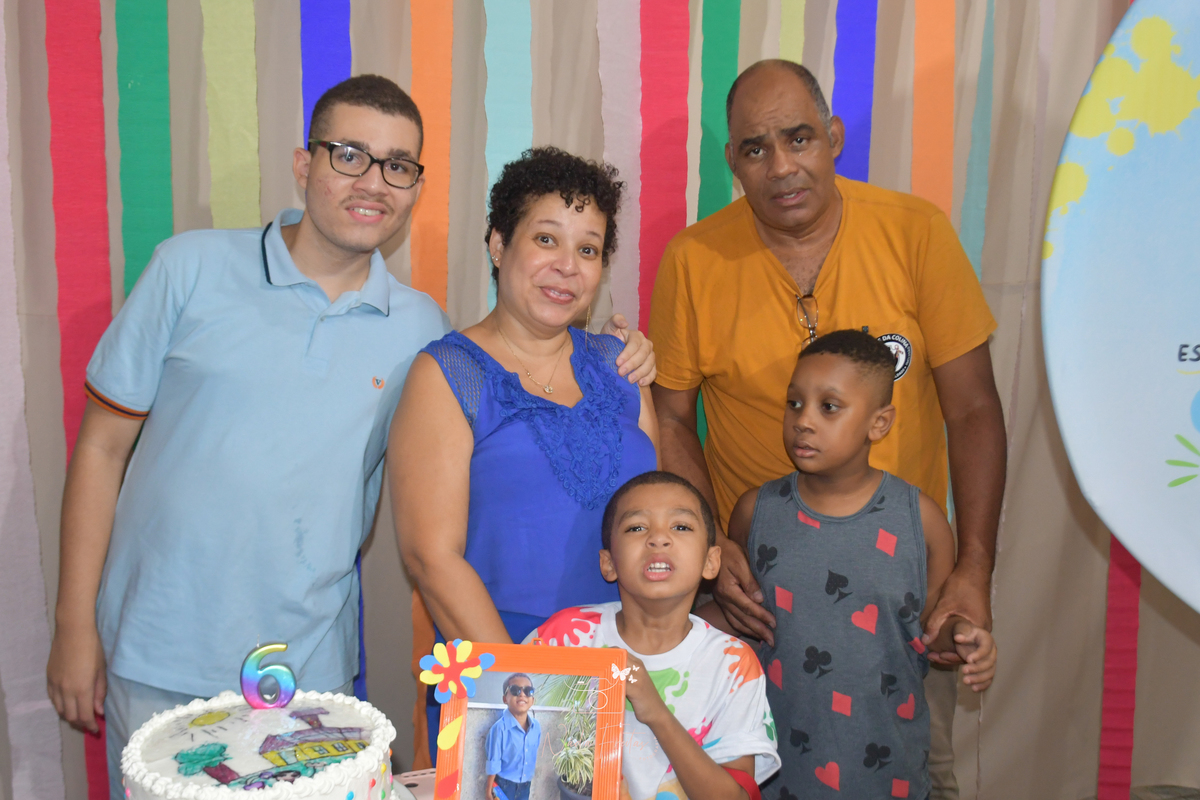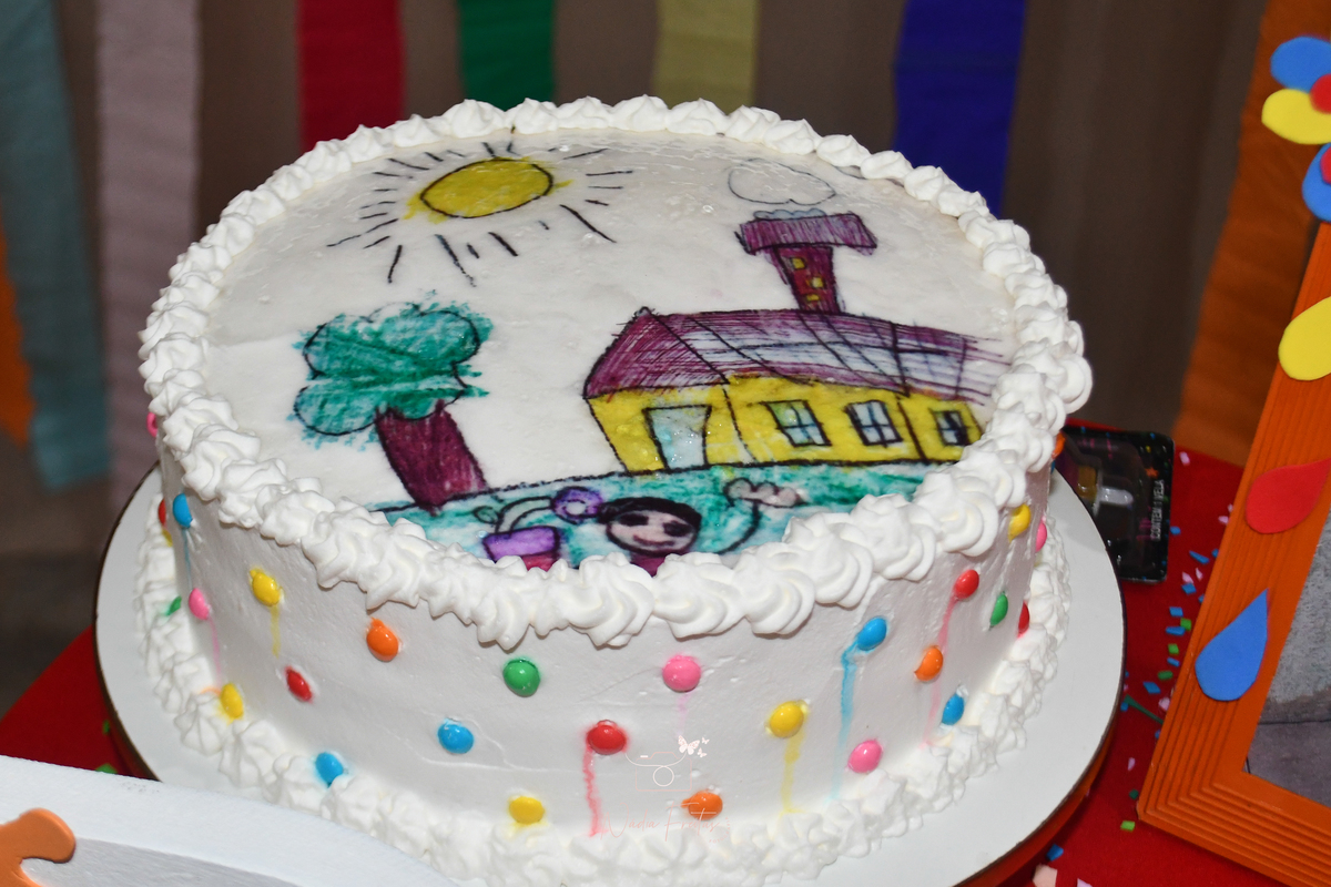 O bolo foi feito com um desenho dele (achei muito legal), e teve uma exposição dos desenhos do Gabriel.